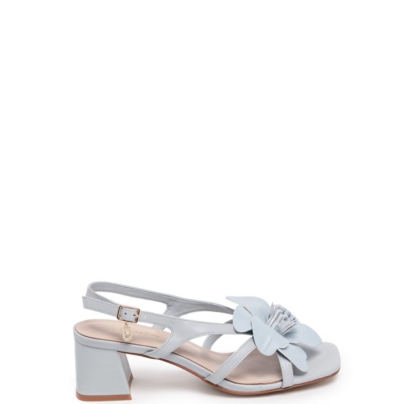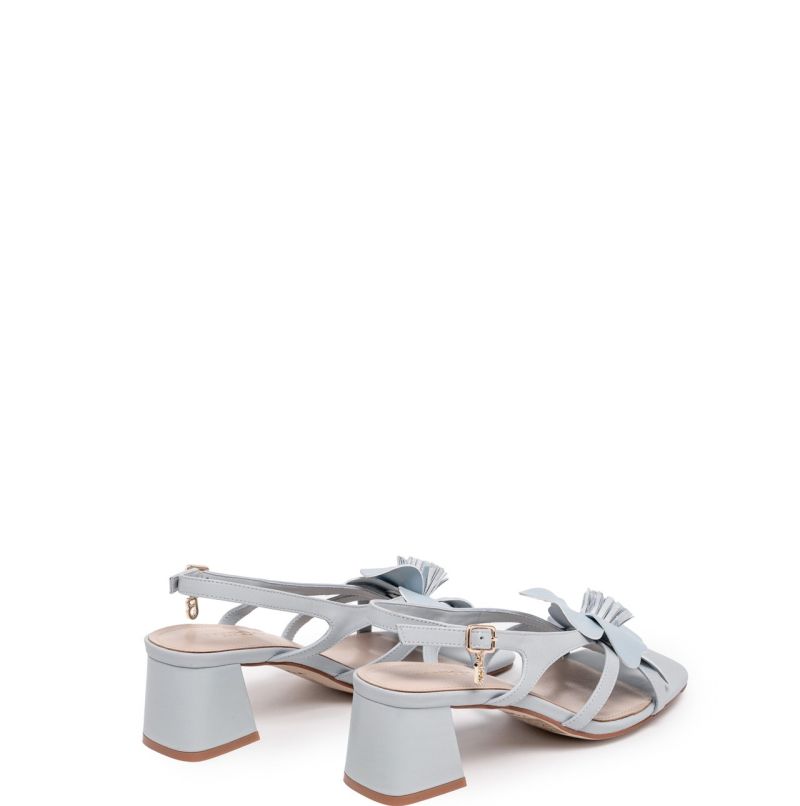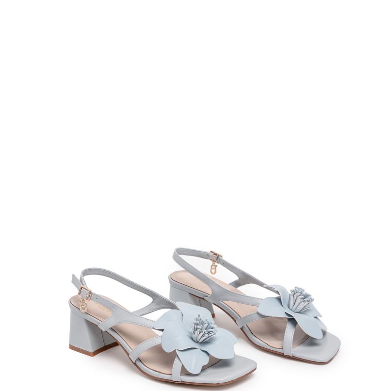 Тези изтънчени сандали са предназначени за тези, които искат да оставят своя отпечатък в най-важните моменти. Изработени изцяло от кожа в светлосин цвят, те привличат погледа благодарение на елегантната флорална апликация и емблематичния монограм, украсен с кристали върху регулируемата каишка. Здравият 6-сантиметров ток изтънява силуета и осигурява висок комфорт, което прави тези сандали идеалният аксесоар, за да бъдете безупречни от първата снимка до последния танц.