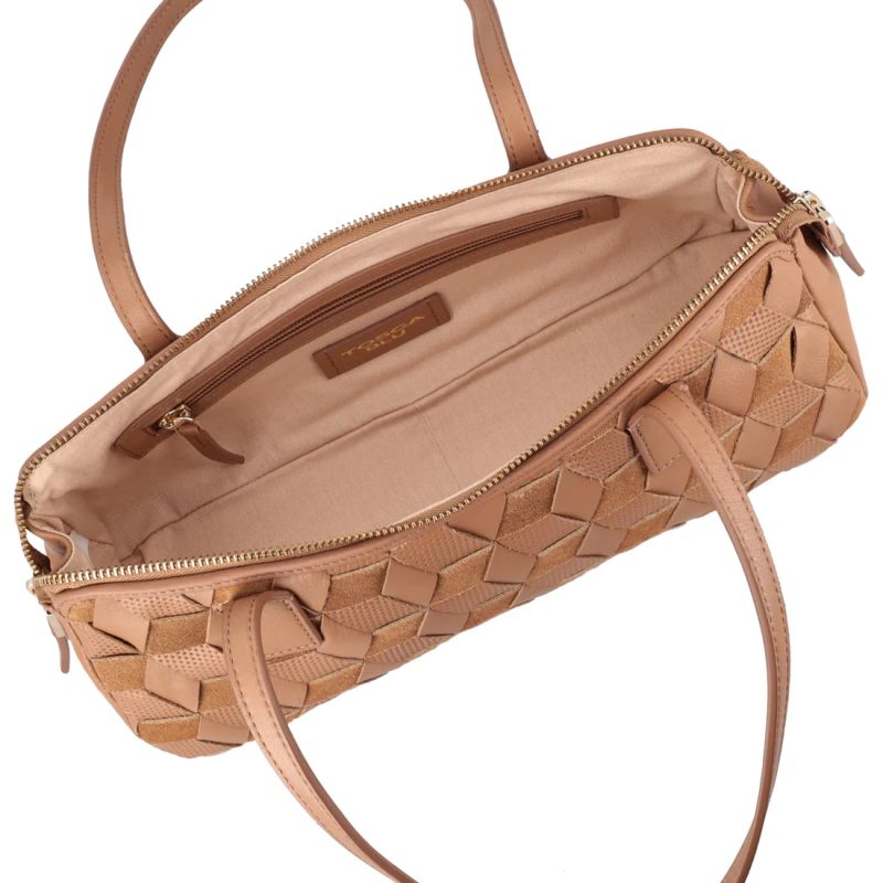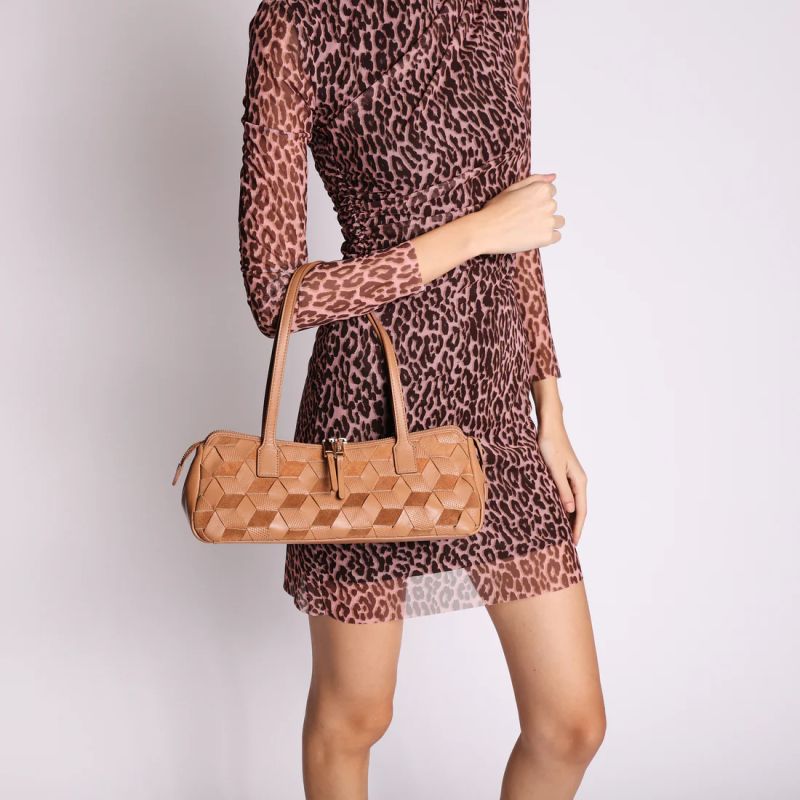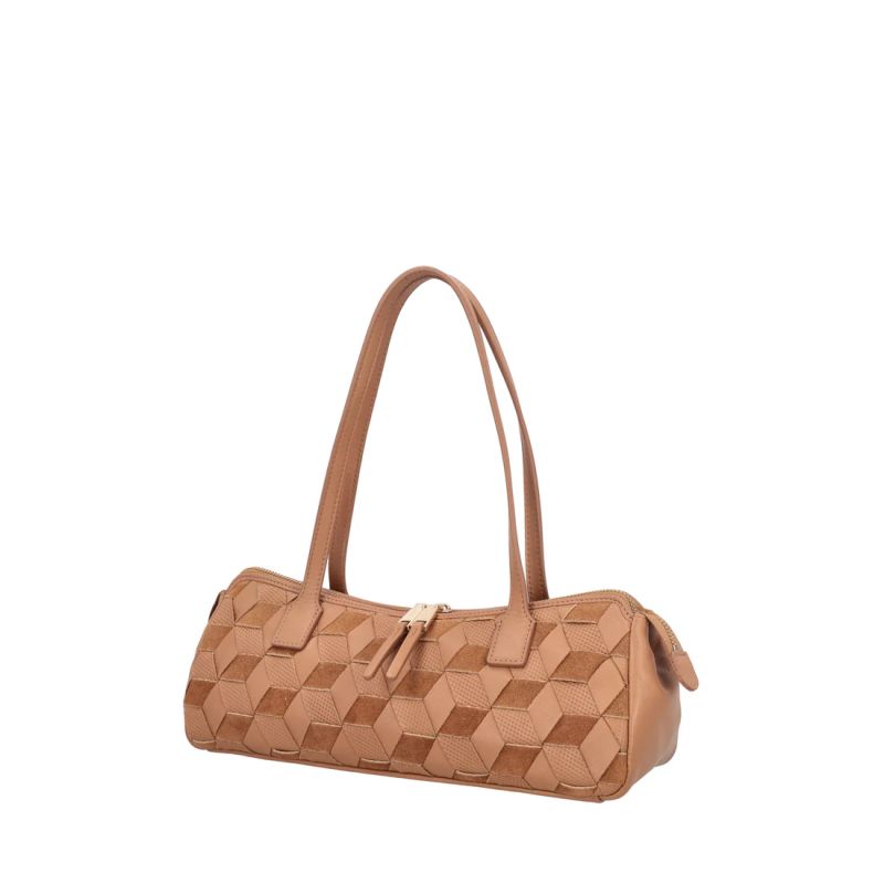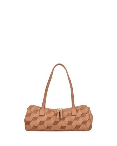 Привличащ погледа аксесоар, който ви съпътства през ежедневието. Тази чанта през рамо в цвят камел, изработена от 100% естествена кожа, с преплетена кожа и велур, който създава триизмерен мотив, съчетаващ гладка, велурена и микроперфорирана повърхност. Удълженият, компактен дизайн е с двойно затваряне с цип, което превръща тази чанта през рамо в незаменим аксесоар за съвременната жена.